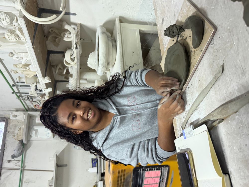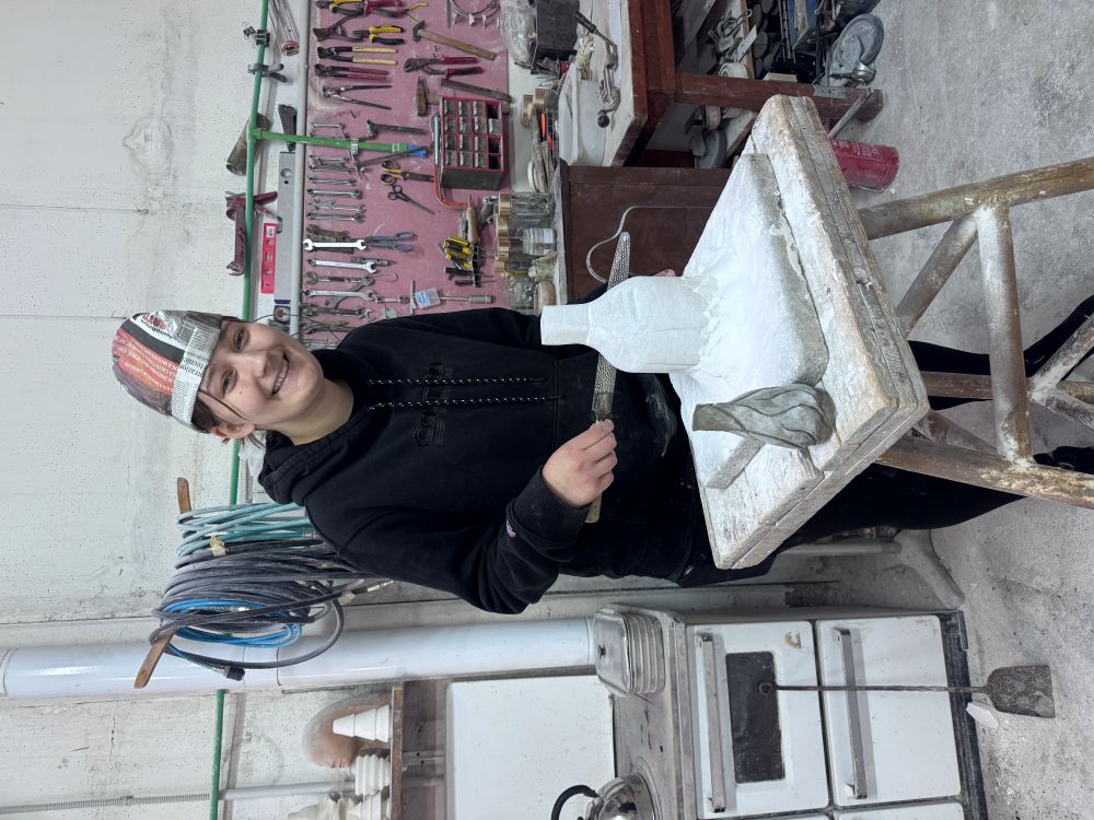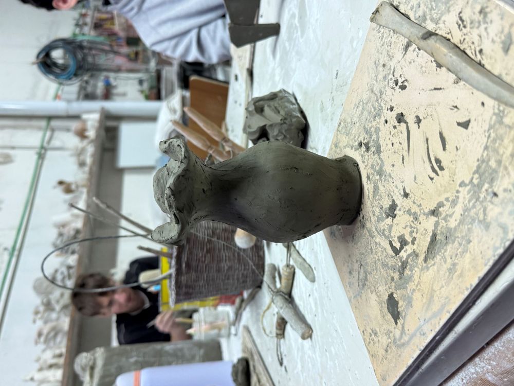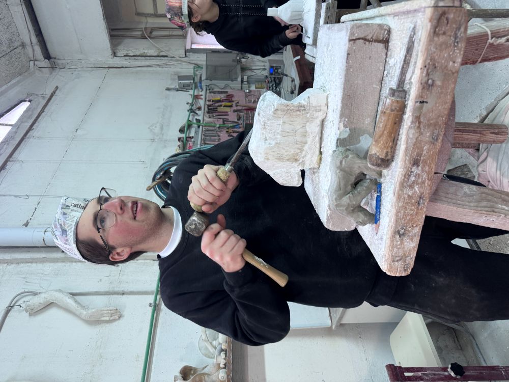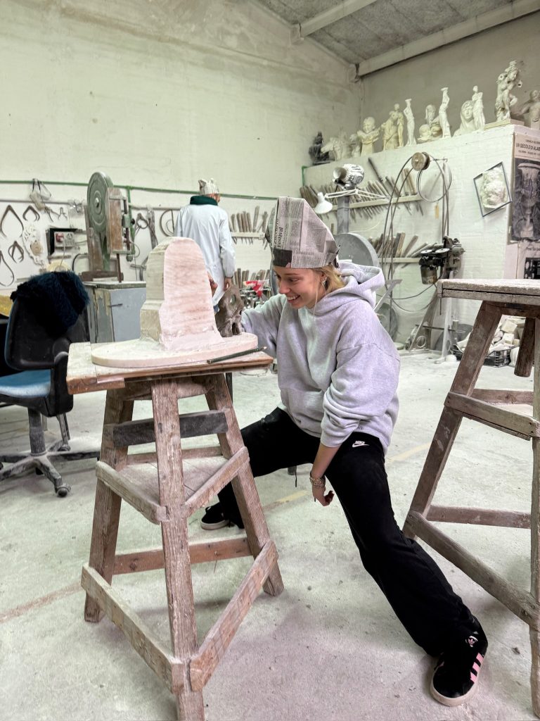 After touring multiple alabaster studios and shops with Giulia, our class was inspired to start our sculptures with sketching ideas, clay modeling, and finally transferring our designs onto stone. Traditionally, artists would fold pieces of paper into hats to wear in the studio to protect their hair, with each artist developing their own unique style. Our group is proud to showcase our own handmade alabaster artisan paper hats, continuing this small but meaningful tradition.
