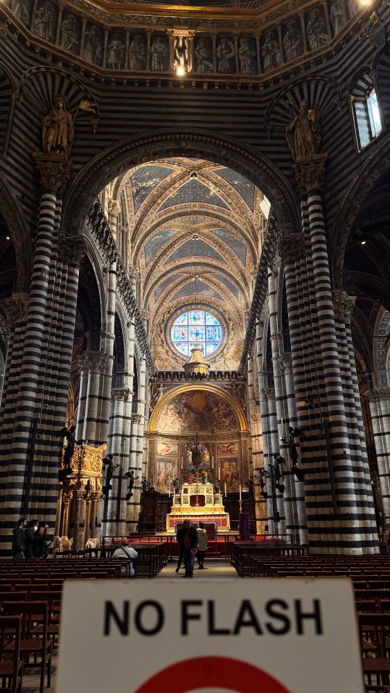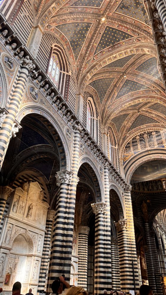 Inside, the cathedral is richly decorated and visually stunning. Black and white striped marble walls and columns define the space, while the intricately detailed inlaid marble mosaic floors feature symbolic scenes. Light filters through the windows and reflects off the painted ceiling, which is covered in gold stars, creating a dramatic contrast between dark and light materials. The overall effect feels layered and almost theatrical.