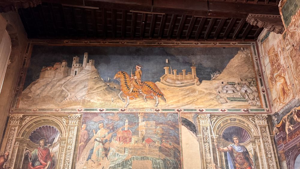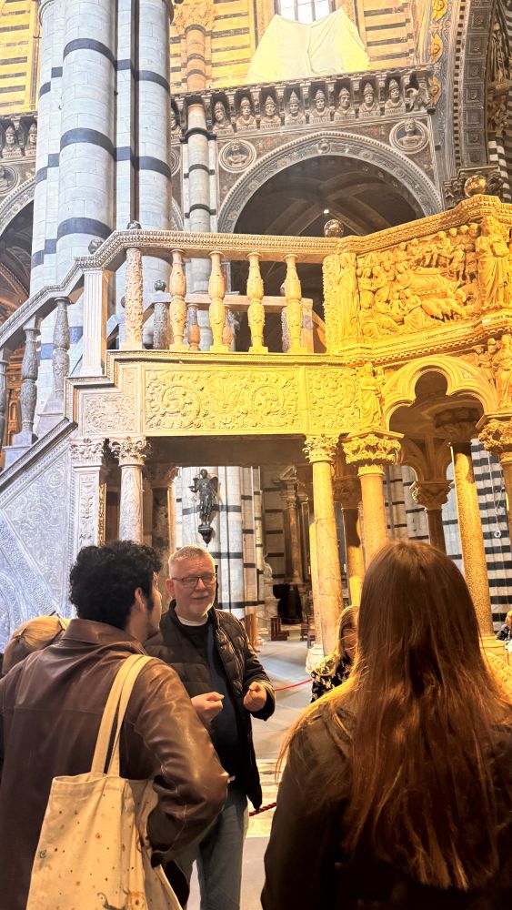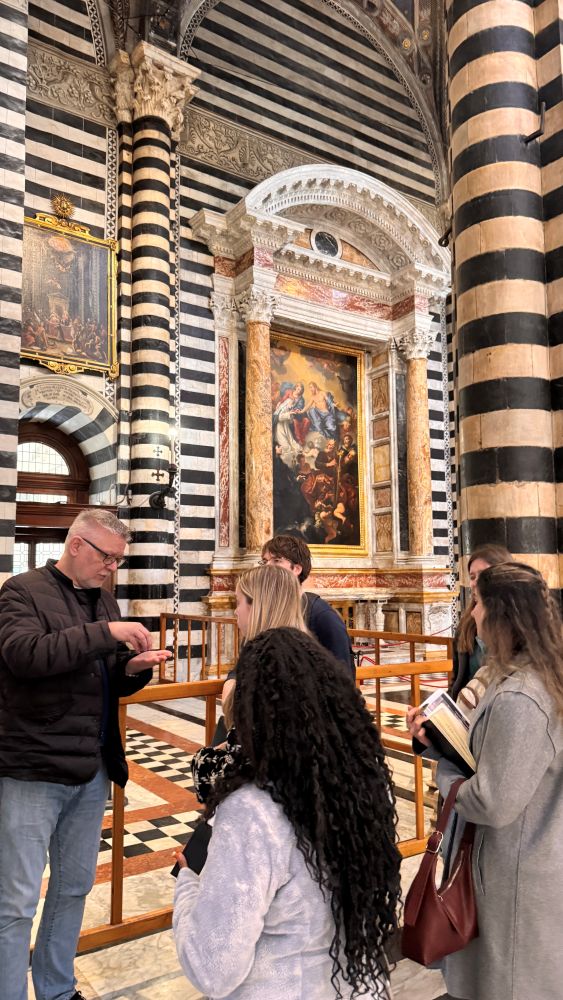 Inside the Palazzo Pubblico are remarkable frescoes, including the Allegory of Good and Bad Government by Ambrogio Lorenzetti, which illustrates the effects of just and unjust rule on society. One piece our group especially liked featured what is considered one of the earliest depictions of a civilian man on horseback. Unlike typical works of the time, it doesn’t portray a saint or noble figure, but rather a soldier. His colorful, detailed clothing suggests pride and skill, highlighting a shift in subject matter.