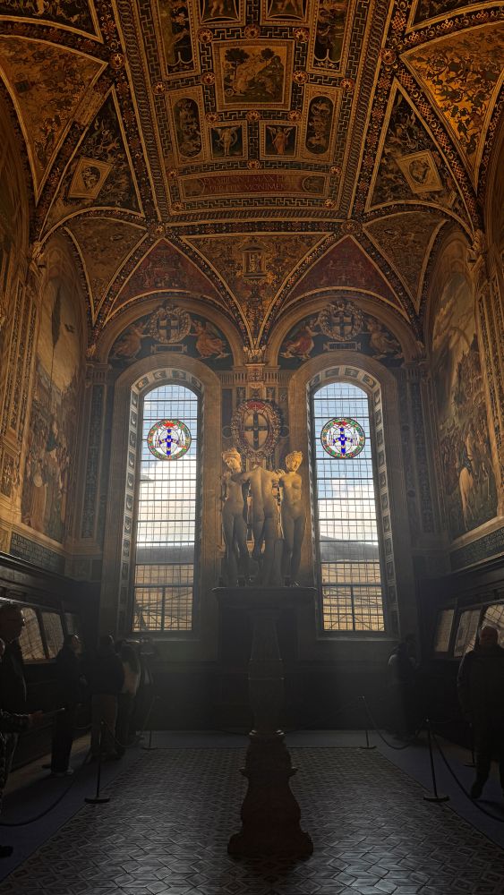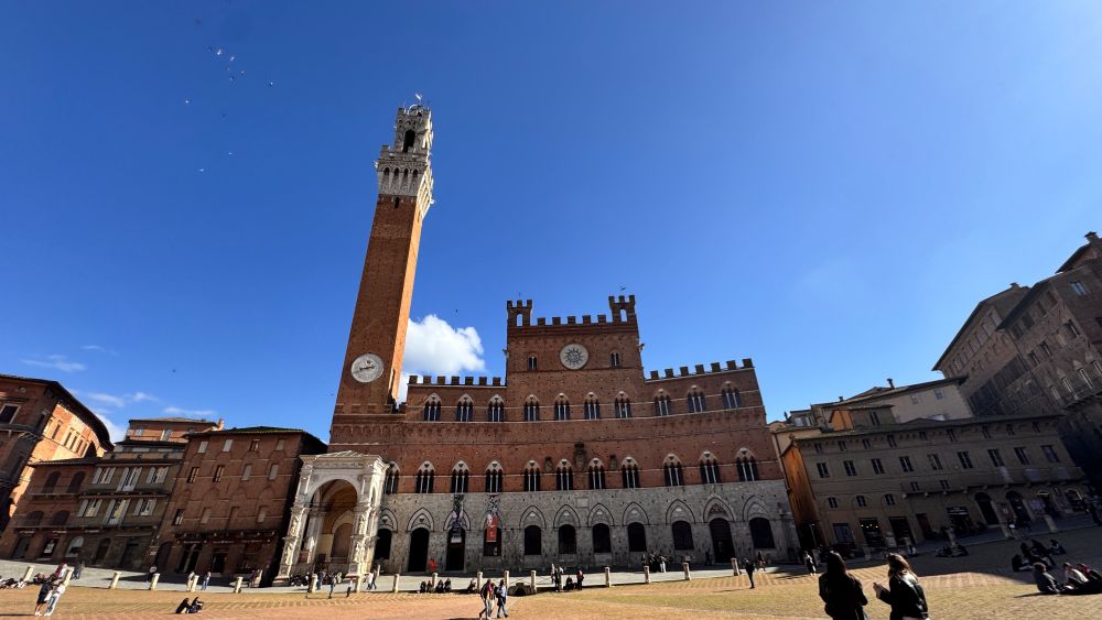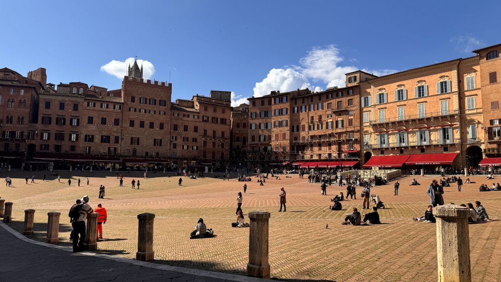 We then made our way to the town hall, the Palazzo Pubblico. Historically, it served as the center of political power, where officials governed the city and managed public affairs, and it still functions as Siena’s town hall today. In front of it lies the Piazza del Campo, a uniquely designed shell-shaped space that slopes gently toward the palace, creating a natural amphitheater. It has long been a gathering place for markets, celebrations, and political events, and it continues to play a central role in the city’s life. The piazza is also home to the famous Palio di Siena, a traditional horse race held twice each summer.