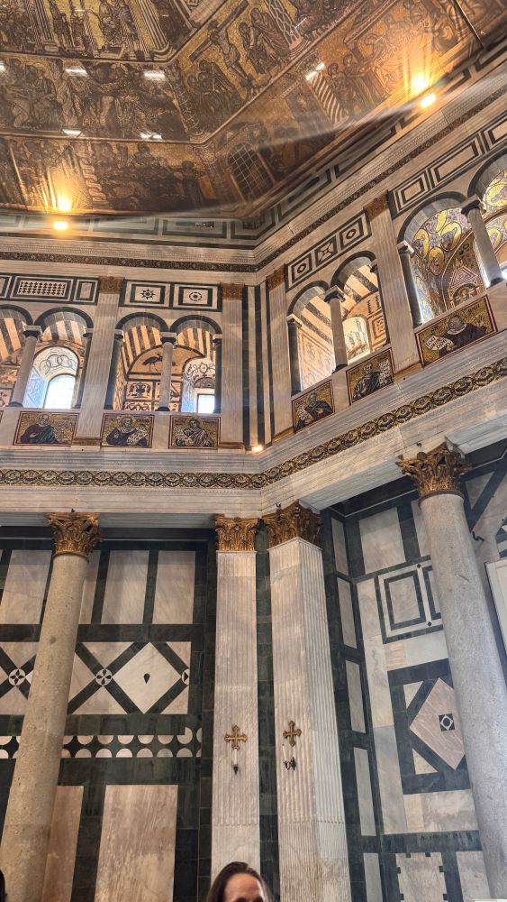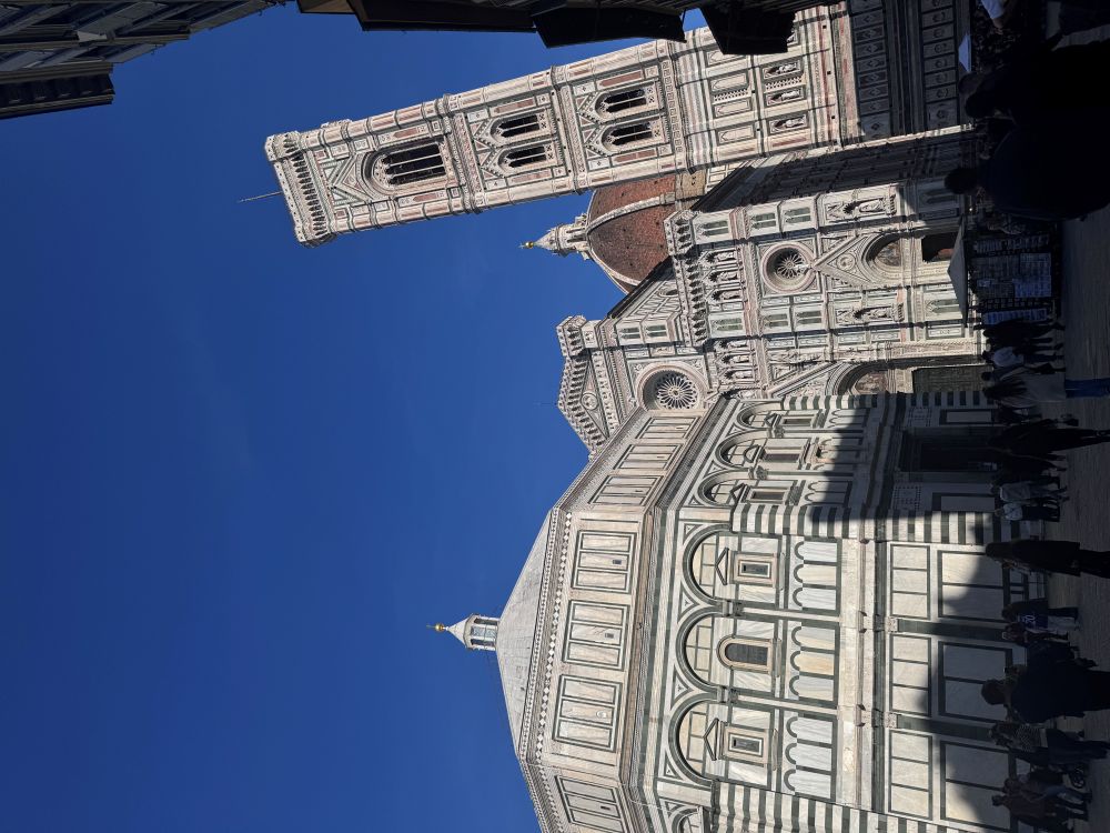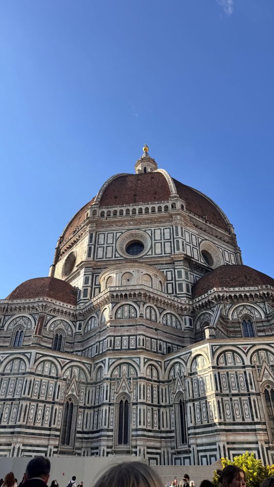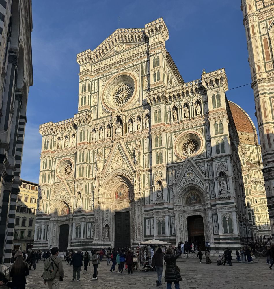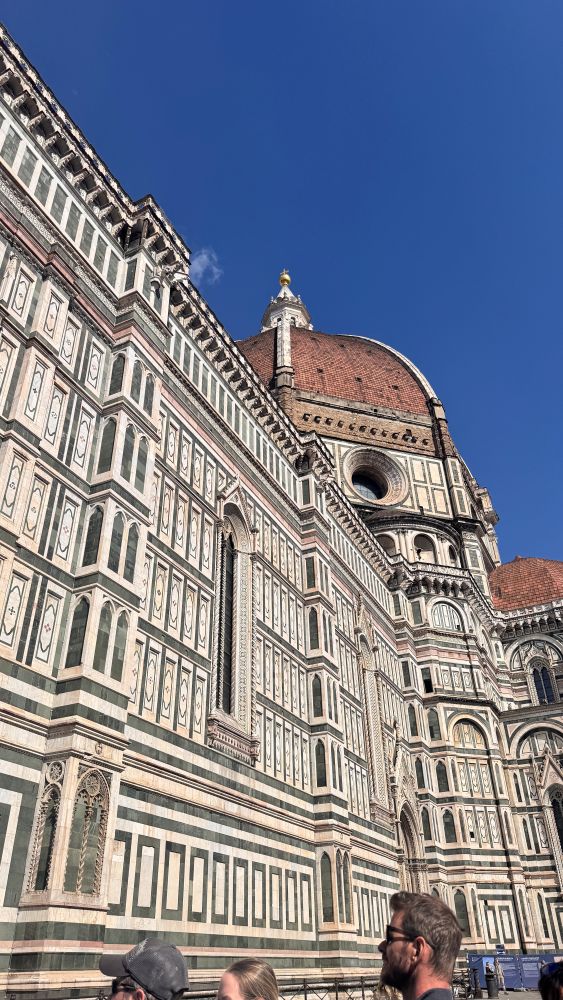 Our very first stop was the Cattedrale di Santa Maria del Fiore. Built in 1296 and completed in 1436, the cathedral is highly decorative and colorful, making it one of Florence’s most recognizable landmarks. Its exterior is covered in panels of white, green, and pink marble arranged in geometric patterns, reflecting Gothic influences while showcasing a distinct Tuscan Gothic style. Unlike England or France, Italy never fully embraced Gothic architecture, resulting in this uniquely Italian expression.