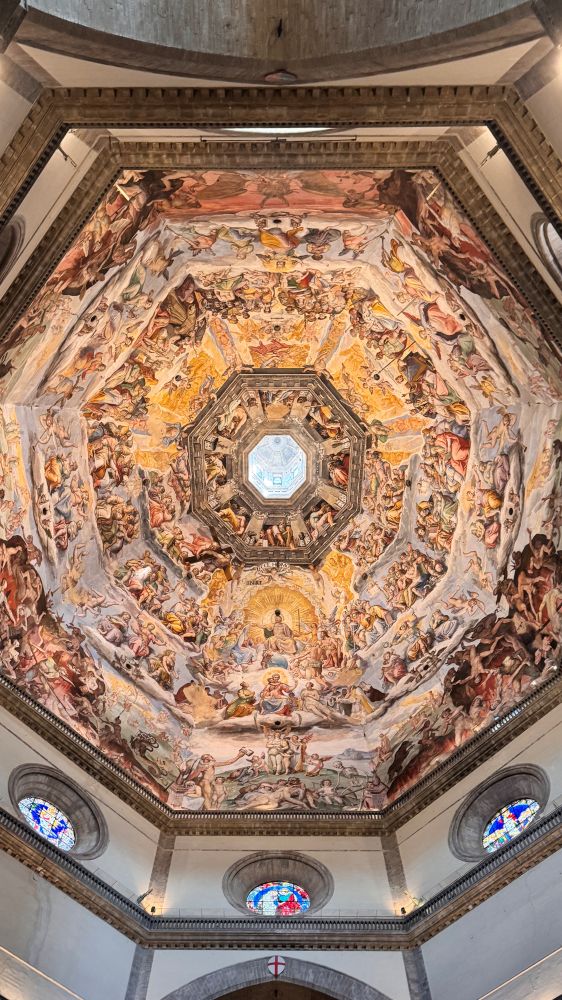 Inside, the cathedral is surprisingly simple compared to its elaborate exterior. The standout feature is the ceiling of the dome, adorned with The Last Judgment fresco painted by Giorgio Vasari and later completed by Federico Zuccari. The painting depicts heaven, hell, and the final judgment, creating a visually stunning and symbolic centerpiece. This simplicity is also especially striking when compared to the richly decorated Florence Baptistry, located just across the cathedral doors, highlighting the different artistic approaches in these two adjacent sacred spaces.