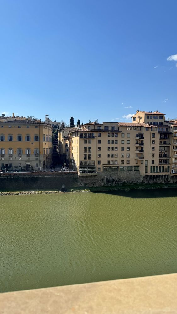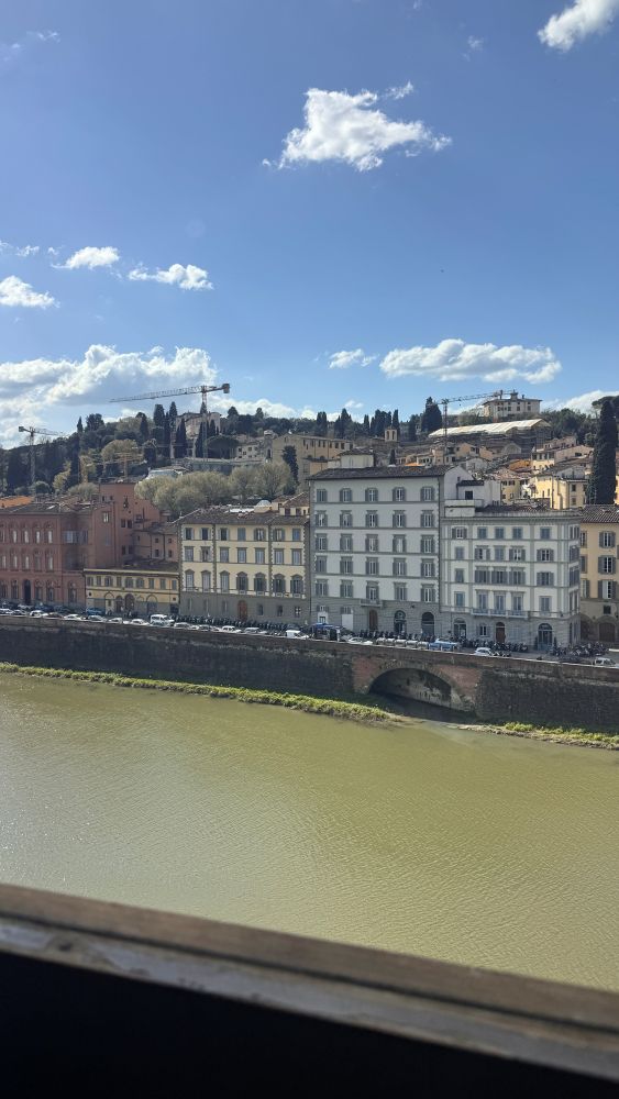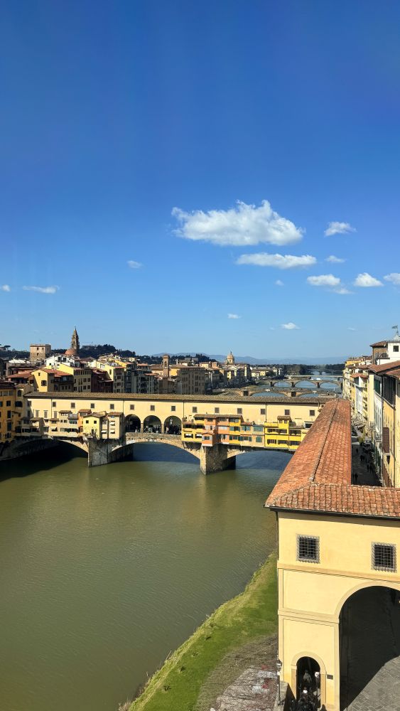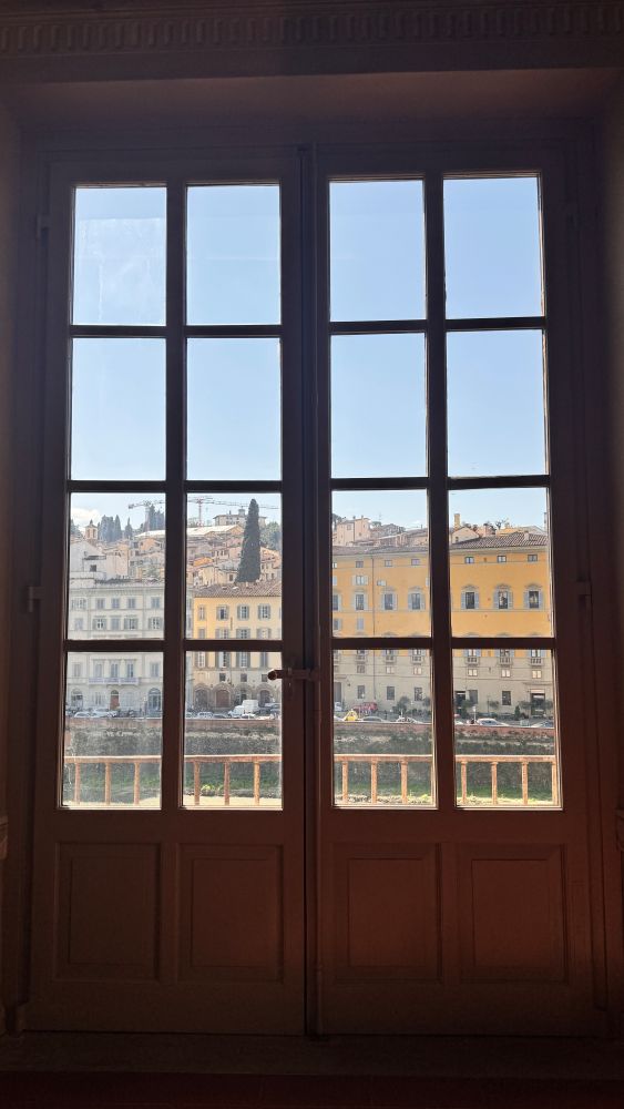 At the end of the gallery, there is a beautiful view overlooking the Arno River. From here, we also saw the Vasari Corridor, an elevated passageway that connects the Uffizi to the Palazzo Pitti, the Medici residence. It passes above the Ponte Vecchio and the river, allowing the Medici rulers to travel safely and privately between their offices and home without walking through crowded streets.